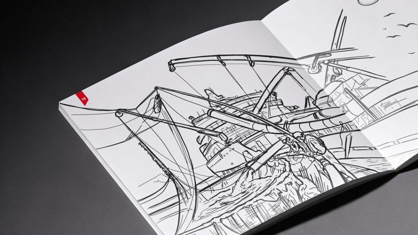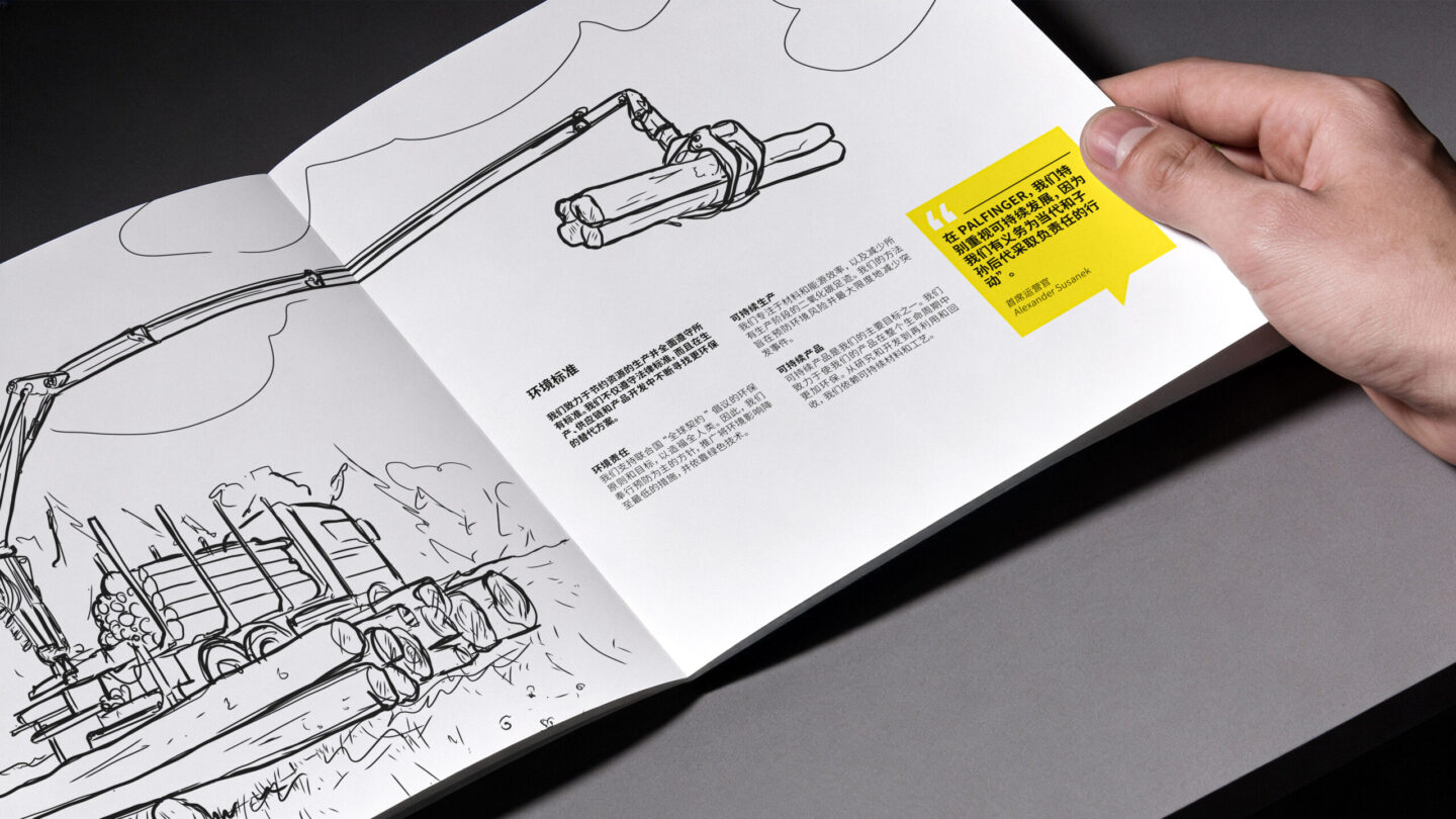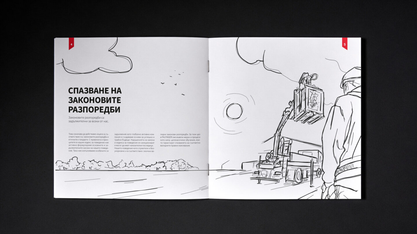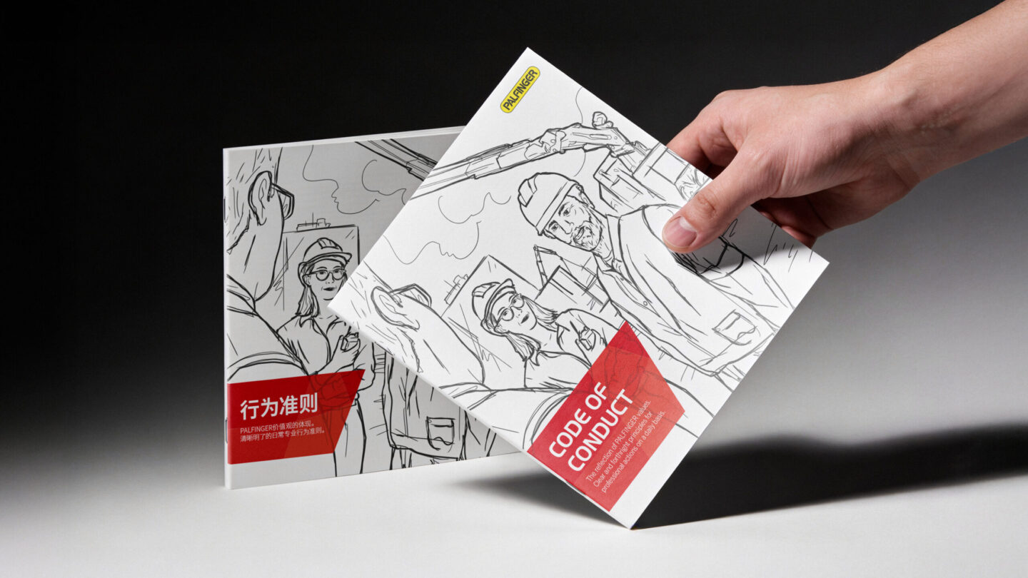 Die größte Herausforderung bestand darin, einen Code of Conduct zu gestalten, der rechtlich präzise ist, aber gleichzeitig ansprechend und lebendig wirkt. Dazu haben wir nicht nur klassische Skizzen genutzt, sondern aus realen Fotos inspirierte Scribbles entwickelt, die die Inhalte in eine einzigartige visuelle Sprache übersetzen. So entsteht ein Dokument, das die trockenen Paragraphen in Geschichten verwandelt, die man gerne liest. Die Kombination aus handgezeichnetem Charakter, feinen Details und mehrsprachiger Umsetzung sorgt dafür, dass die Werte des Unternehmens weltweit verständlich und erlebbar sind. Jede Illustration wurde gezielt entwickelt, um den Inhalt zu unterstützen, nicht zu ersetzen – ein kreativer Spagat zwischen Compliance und Design. Das Ergebnis: Eine Broschüre, die Palfingers Grundsätze sichtbar macht, Mitarbeiter motiviert und gleichzeitig ein eigenständiges, charaktervolles Medium darstellt.