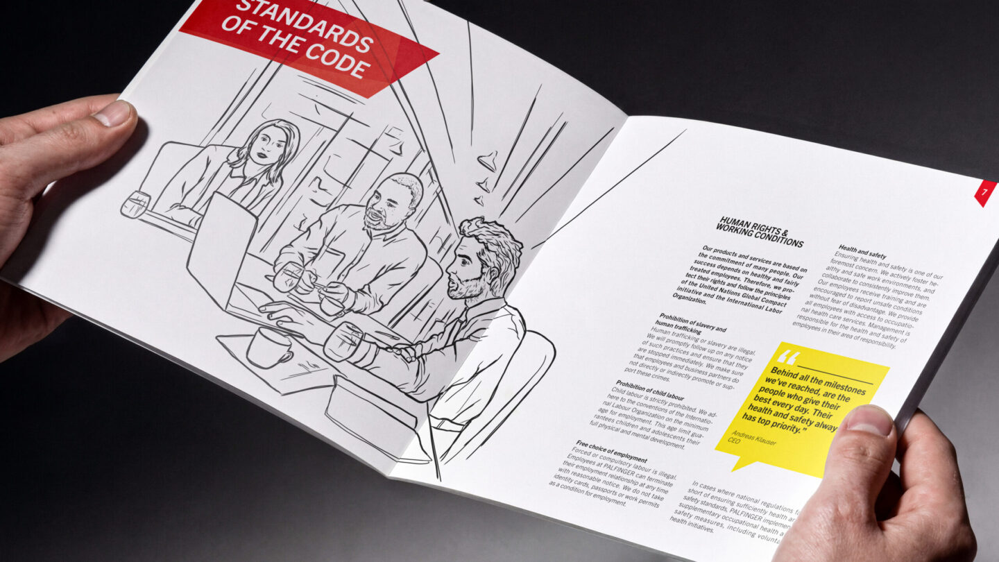 Für Palfinger haben wir den Code of Conduct in ein lebendiges Leseerlebnis verwandelt. Anstatt trockene Paragraphen zu präsentieren, wird jede Seite durch Scribbles und kreative Illustrationen aufgelockert. Die Broschüre kommuniziert Werte und Regeln spielerisch und lädt die Mitarbeiter zum Entdecken ein.