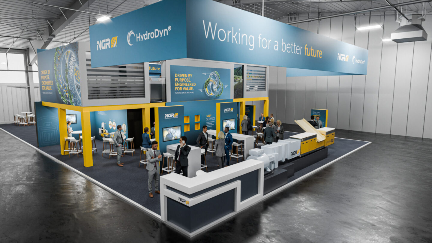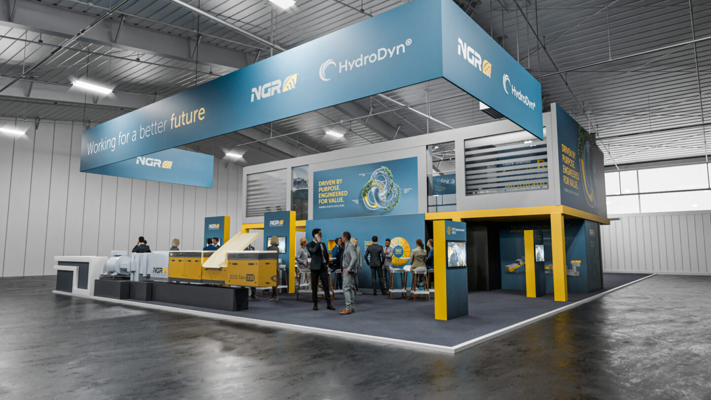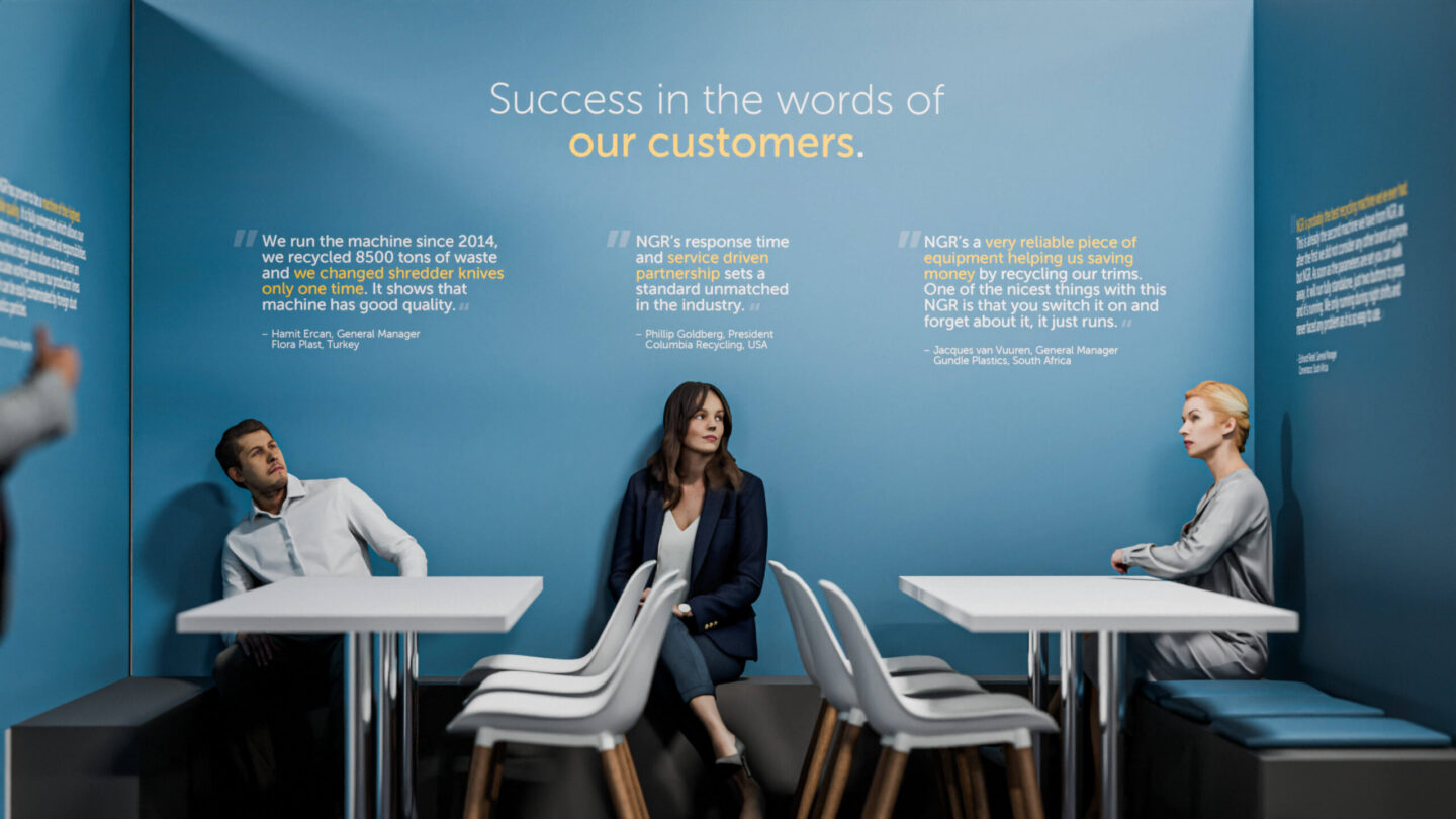 Das zweigeschossige Standkonzept verband Technologie und Begegnung. Im Erdgeschoss wurden die drei Recyclingbereiche klar gegliedert präsentiert mit großflächigen Visuals, technischen Details und der neuen 360°-Service-Grafik, die NGRs Serviceversprechen in den Mittelpunkt rückt.